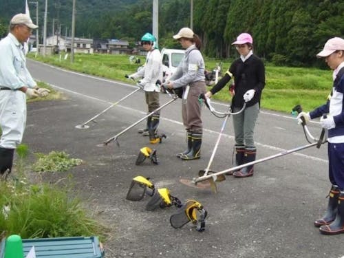 【棚田大学 実地研修】10:20〜 棚田での農作業に必須の、刈り払い機使用について実地研修! 小型の機械についての扱いやリスクを学べます。 習得できたら棚田での活躍スキル大幅アップ♪