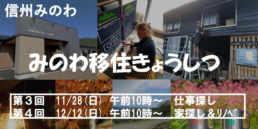 ★第3回 11月28日(日)午前10時~ (ZOOM) テーマ:移住&仕事探し ゲスト:小島さん(いくつかの市町村で仕事探しを行った経験をお持ちです) 上伊那広域連合 地域振興課(箕輪町周辺の求人状況について) (株)ローカルライフ(シェアオフィス紹介、移住者さんも働いている会社です) 申 込:こちらから→https://www.rakuen-shinsyu.jp/modules/event/page/1655