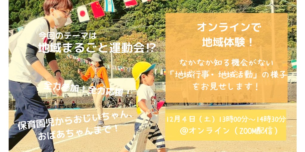◆イベント詳細◆ 【開催日時】2021年12月4日(土)13時00分~14時30分(途中入退室可) 【方法】ビデオ通話 Zoom 【参加費】無料 【参加方法】参加希望の方は、「応募ボタン」を押してください! スタッフがZoomURL等をメッセージ又はメールでお送りします。 【スケジュール】 ●開会 ・飯田市の紹介 ・地域活動ってどんな内容? ●第1部 地区の運動会を覗いちゃおう! ・運動会動画の配信 ・ゲストとのクロストーク ●第2部 先輩移住者に聞く田舎暮らしや地域活動のあるある