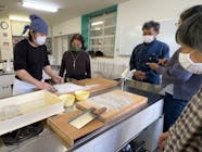 別日には、地域の人と蕎麦打ちを行い、自分で打った10割蕎麦を食べた。 皆で一緒に蕎麦打ちをするのはとても楽しい。自分で打ったそばは、細い部分も、太い部分も混じっていたけれど、それもまた美味しかった。
