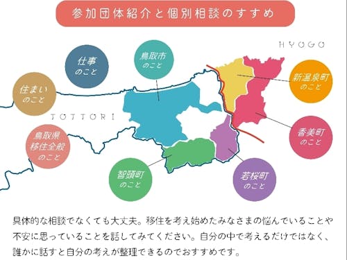 東西に長い鳥取県は、東部・中部・西部の3圏域に分かれているのが特徴。それぞれの圏域によって、人柄も方言も異なると言われていますが、そこで暮らす人たちはどんな日常を過ごしているのでしょうか。また、各圏域のしごと事情、すまい事情はどうなっているのでしょうか。 三回目の今回は、鳥取県東部の鳥取市・若桜町・智頭町に加え、古くから歴史や文化、生活圏を共有してきた兵庫県新温泉町・香美町も参加する貴重な機会です。 鳥取県からは移住相談員以外に、東部担当の就職コーディネーターや住宅相談員にも参加いただき、仕事と住まいについて、詳しくお話を聞いてみようと思いますので、お楽しみに!! それでは、みなさまにお会いできることを、相談員一同楽しみにしております!!