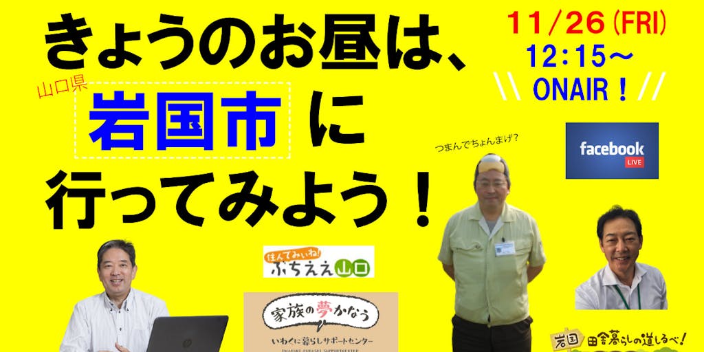 2021/11/29山口県内で移住サポートをしてくれる相談窓口や相談員の皆様を紹介しながら、 県内の個性的な市町の魅力をお伝えする、お昼の名物Facebook Live、 「きょうのお昼は、〇〇に行ってみよう!」