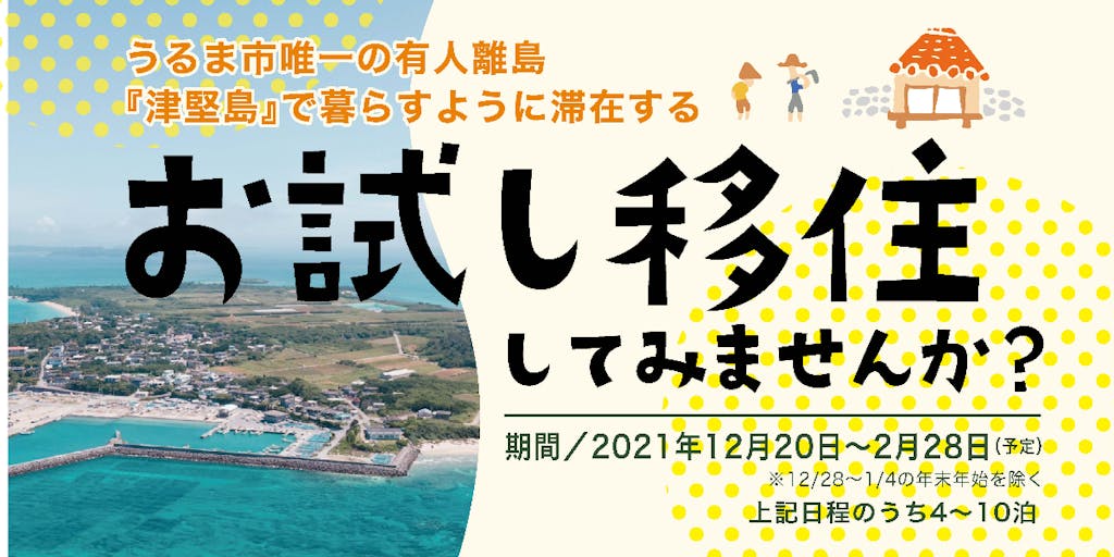 沖縄県うるま市のお試し移住は、島しょ地域の民家に実際に住む感覚で滞在していただき、地域の方との交流などを通して島の住環境を体験しながら、ご自身の移住へのイメージをもってもらうことを目的としています。今回は、唯一の有人離島『津堅島』で開催します!