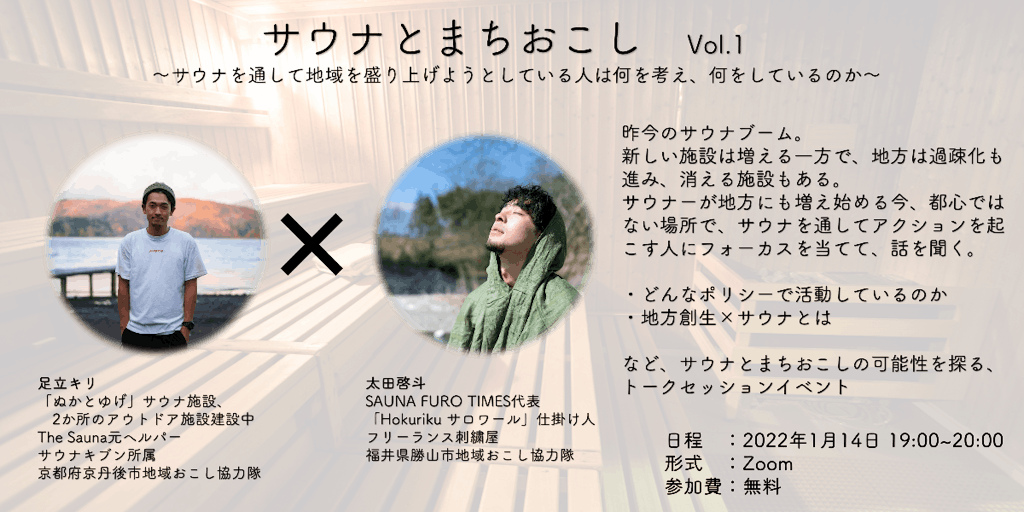 2022/01/14サウナーが地方にも増え始める今、都心ではない場所で、サウナを通してアクションを起こす人にフォーカスを当てて、話を聞く、トークセッションイベント。