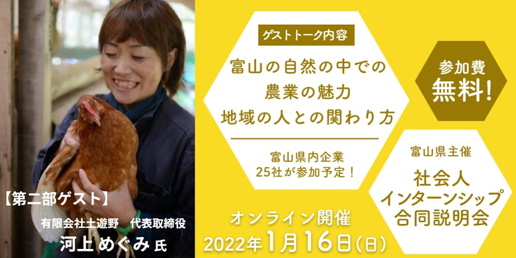 2022/01/13富山県では、転職・移住・キャリアアップなどを検討している社会人の方を対象として、県内企業25社(予定)がオンラインで一堂に会し、社会人向けのインターンシッププログラムの説明を行う「社会人インターンシップ合同説明会」を開催いたします。