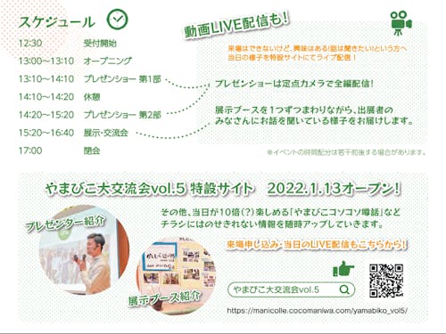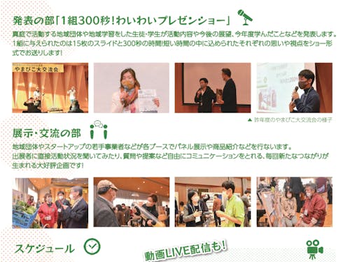 ・スケジュール: 12:30 会場・受付開始 13:00 開会 13:10 発表の部「1組300秒!わいわいプレゼンショー」 15:20 展示・交流の部 17:00 閉会