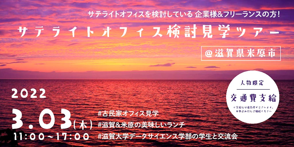 ・定員:5名 ・最小催行人数:1名 ・解散場所:JR米原駅 ・スケジュール: 11:00 米原市役所 ・米原市役所視察(コワーキングスペースもあります〜) 12:00 ランチ ・米原市内のお店で滋賀グルメ・ランチ 13:30 古民家 ・改修してオフィスにしているところを視察 ・移住者/サテライトオフィスとして活用している人の話を聴きます 16:00 滋賀大学 ・データサイエンス学部の学生たちと交流 ・学生の就活状況も聞けちゃいます 17:30 解散