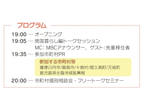 ・定員:40名 ・最小催行人数:1名 ・スケジュール: ●18:4519:00 開場・受付 ●19:00 オープニング ●19:05~ 南国暮らし編トークセッション MC:MBCアナウンサー ゲスト:先輩移住者2組 ●19:35~ 参加市町村等PR(5市町村+県・北薩地域振興局) ●20:00~ 市町村個別相談会・フリートーク ●20:50~ 終了