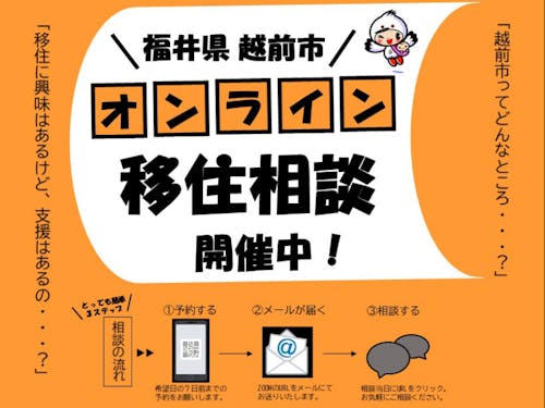 【開催方法】 Web会議サービス「Zoom」を使用しての相談となります。 【開催の流れ】 ①越前市オンライン移住相談予約フォームに必要事項を記入して送信してください。 ②後日、越前市政策推進課から、「Zoom」を使用したオンライン移住相談の招待URLを電子メールで送信します。 ③予約の日時になりましたら、招待URLをクリックしてオンライン移住相談に接続してください。 ※注意事項 ・マイク、カメラのついたパソコン、タブレット、スマートフォン等をご用意ください。 ・タブレットやスマートフォンはZoomアプリのダウンロードが必要となります。