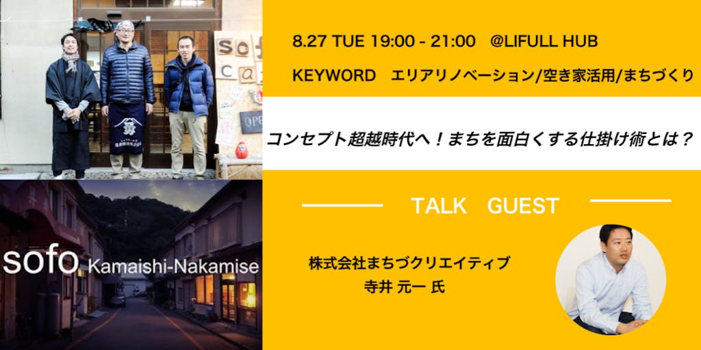 今回のイベントは、長年、「まちづくり」を事業化している株式会社まちづクリエイティブ代表取締役・寺井元一氏のキートークを冒頭に迎え、昨年度岩手県釜石市でエリアリノベーション会社を設立し、商店街を中心に新しい事業を手掛ける実践者として挑戦している2名のリアルな話をお届けします。