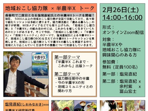 【内容】 ■Session 1:書籍『半農半X これまで・これから』出版トーク [塩見直紀 三村信也] ■Session 2:「地域おこし協力隊」x「半農半X」トークセッション [塩見直紀 余村紫 冨山宏士 三村信也]