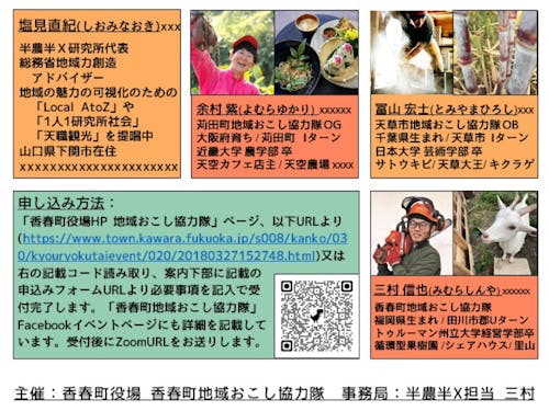 【募集要項】 ■対象者:半農半Xや地域おこし協力隊に興味関心のある方 ■参加費:無料 ■申込方法:事前申込制(前日までにZoomURLをお知らせします。) ■問い合わせ先 主催:香春町役場 香春町地域おこし協力隊 事務局:半農半X担当 三村