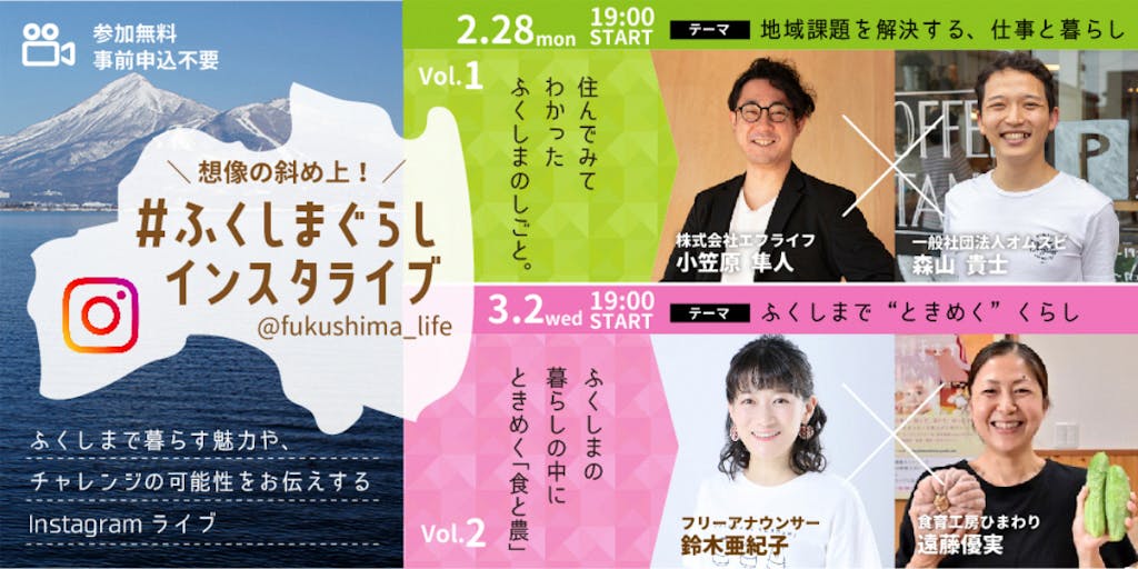 2022/05/15ふくしまで暮らす魅力や、チャレンジの可能性をゲストのトークでお伝えする、インスタライブを2/28、3/2の2回で開催します。 移動中や、おうちでのんびりしながら見たり、お好きなスタイルで是非ご視聴くださいね!