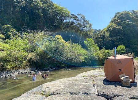 【山の中の川でやるテントサウナ】 サウナ好きの友達に教えてもらって、勢いでテントサウナを購入。 川の側にサウナ用のテントを立てて、水風呂がわりに綺麗な川に飛び込む。そして外気浴でととのう。最高。 こちらもやりたい方がいましたらぜひ一緒にやりましょう!