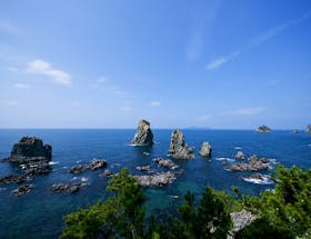 奇岩群が立ち並ぶ迫力の絶景パワースポット、『青海島(海上アルプス)』 標高333mの高台に広がる草原から、 眼下に果てしなく広がる海と空の一大パノラマが展開する『千畳敷』 など、 周辺にある遊歩道などを利用しながら、 日本海の荒波とコバルトブルーの織り成す奇跡の風景を楽しむことが出来ます。