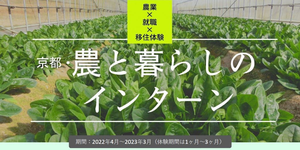 2023/03/31“農業法人に就職して田舎暮らしがしたい”、“将来農業を生業にしたい”、“地域貢献したい”、 そんな皆さま、お待たせしました! 農業の経験を積み、さらに田舎暮らしの体験も同時にできるチャンスです。 農業インターンシップや農業体験研修、農村生活体験を、“お試し住宅”等とセットでご案内するのが 「京都・農と暮らしのインターン」! 農業や農村での生活を今すぐ体験、 疑問や不安を解決して、 理想の移住を実現させましょう。