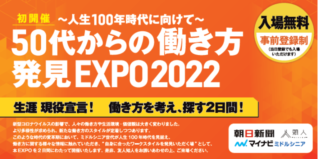 2022/06/18ミドル・シニア世代が人生100年時代を見据えて、働き方に関する様々な情報に触れ「自身に合ったワークスタイルを発見する場」として開催されるイベント『50代からの働き方発見EXPO2022』が開催されます。