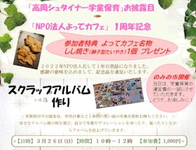 創作活動としては、植物の染物やソープカービング、粘土細工やトンボ玉などを始め、毎年恒例になっているものとしては、12月の木彫刻の街「井波」の伝統を生かし、木を使った「干支作り」、さらに、3月には1年を振り返り、思い出の写真を持ち寄り、「スクラップアルバム作り」を開催しています。