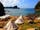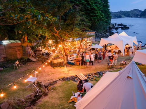 目の前が海で、三方を山に囲まれたまるで無人島のようなロケーションにある、船でしか行けない1日1組限定のプライベートキャンプ「AQUA VILLAGE」「REN VILLAGE」で、平均利用人数は1組25名程で、最大150名程を収容可能。