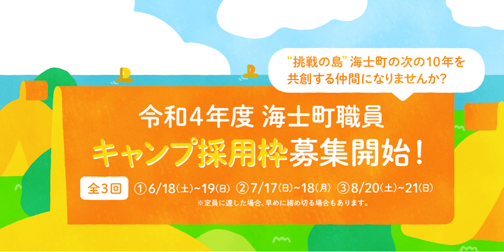 【令和4年度海士町正規職員キャンプ採用枠試験】 ◯試験概要 海士町が掲げる「半官半X」という新しい働き方を共に創りながら、下記の事業分野で海士町職員として、島を盛り上げてくれる方を募集します!
