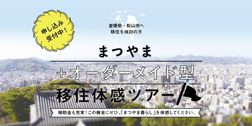 2022/07/08「まつやまオーダーメイド型移住体感ツアー」を開催します! このツアーは参加者の希望や都合に合わせて、日程や訪問先などを自由に設定できます。 観光では味わうことができない、それぞれの移住目的に応じた「まつやま暮らし」をより具体的に想像できる行程をご用意させていただきます。 「松山に住みたいと思っている」、「子ども連れのため、団体ツア―には参加しにくい」など、この機会にぜひ、「まつやま暮らし」を体感ください!! また、ツアーの交通費、宿泊費などに対して補助金もあります。 お申し込みは7月8日(金)まで! 本気で移住を考えられている方を、松山市が全力でバックアップします。 皆さんのご参加をお待ちしています♪