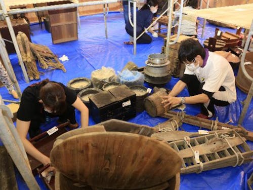「奥能登国際芸術祭2020+」では、大勢の市民ボランティアを巻き込んで、「大蔵ざらえ」と銘打ち、古い蔵を掃除して先祖伝来の生活の品々(民具)の数々を収集しました。 「蔵ざらえ」は、商店が店じまいするときに使われる言葉ですが、過疎高齢化の進む珠洲においては「家じまい」が進んでいます。そこにはなじみ深い家具や食器、衣食住や祭りに関わる道具、農林漁業や製塩など生業に関わる品々・個人の思い出を綴った日記やアルバムなど、貴重なものが無数にあります。
