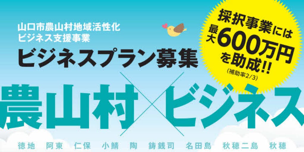 2022/08/31山口市内の農山村エリアは、人口減少や大都市圏への転出超過、少子高齢化の進展が続いており、地域課題の解決と地域の活性化に取り組む必要があります。 一方で、農山村エリアには、優れた地域資源が多くみられるます。そこで、その地域資源を活用し、潜在的な地域の強みを生かしたビジネスを展開することで、雇用の創出や地域経済の波及効果の創出、地域課題の解決などの地域の活性化につながる事業計画を募集し、支援します。 事業の採択にあたっては、事業計画を提案していただき、コンペティション方式の審査委員会で審査し、採択された事業については、予算の範囲内で最大600万円を支援します。また事業経費の調達にクラウドファンディングを活用する場合は、その手数料部分について、更に補助率10/10、補助上限額100万円を交付します。
