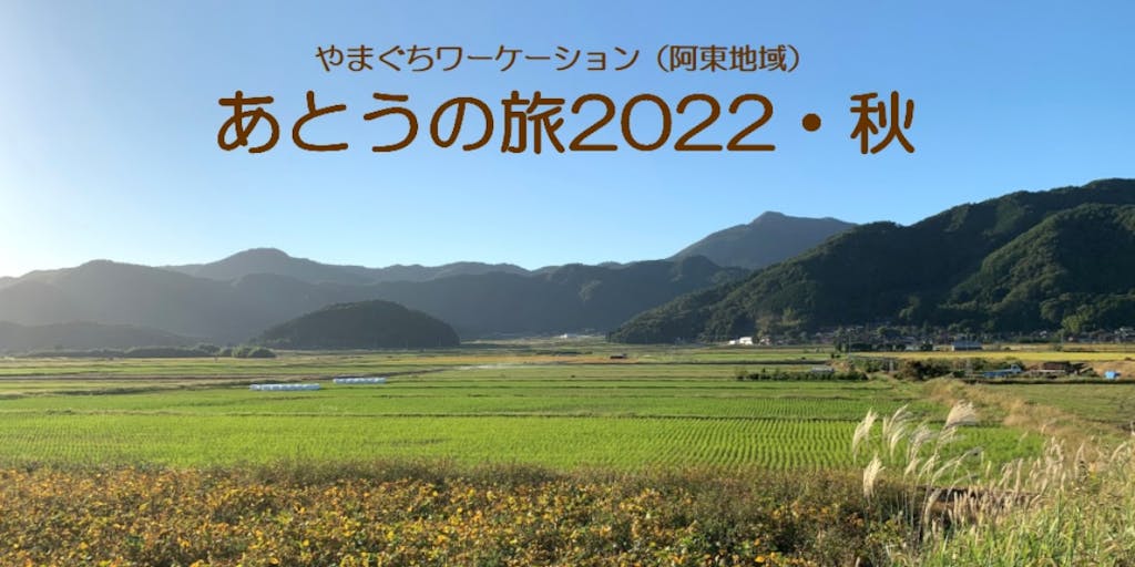 昨年度夏・秋に実施しました「あとうの旅」に引き続き、やまぐちワーケーション(阿東地域)「あとうの旅2022・秋」を実施しますので、ご興味のある方はぜひお申し込みください。 詳しくはこちら → https://www.city.yamaguchi.lg.jp/soshiki/26/127426.html 興味のある方は、ぜひ「興味ある」ボタンも押してください!