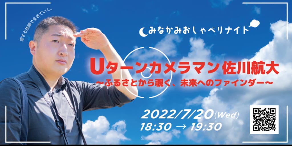 いなかとつながる みなかみおしゃべりナイト 「Uターンカメラマン佐川航大〜ふるさとから覗く、未来へのファインダー〜」 開催日:2022年7月20日(水)18:30〜19:30 会場: ZOOM(放送場所:テレワークセンターMINAKAMI) 主催: みなかみ町 みなかみローカルチャレンジサポート事業FLAP