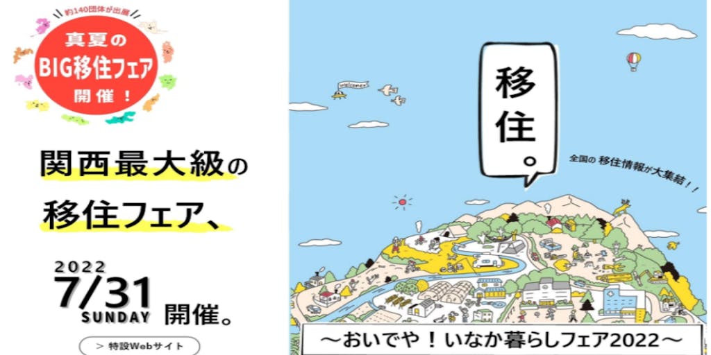 2022/07/31全国各地の移住担当者と直接相談ができるイベント! 関西最大級の移住マッチングイベント『おいでや!いなか暮らしフェア』 今年も7/31に大阪で開催されます。