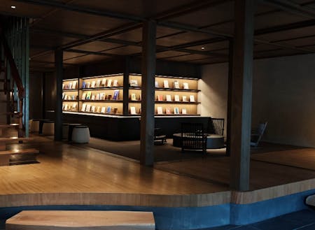 更に一階ロビーを拡張して、「ことば」や「詩」を中心としたライブラリーを設けました。これまで閉鎖的だった旅館のロビーを、人々がゆるやかに交流できるような開放的なラウンジスペースに生まれ変わらせたかったのです。城崎温泉は、小説の神様と称せられる志賀直哉の「城の崎にて」をはじめ、多くの文学を生み出してきた”文学のまち”としても知られています。そのレガシーの継承とともに、小林屋らしい書籍のセレクトをブックディレクターの幅允孝さんと共に考えました。