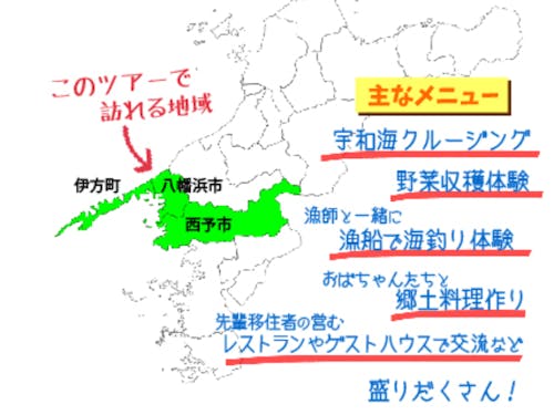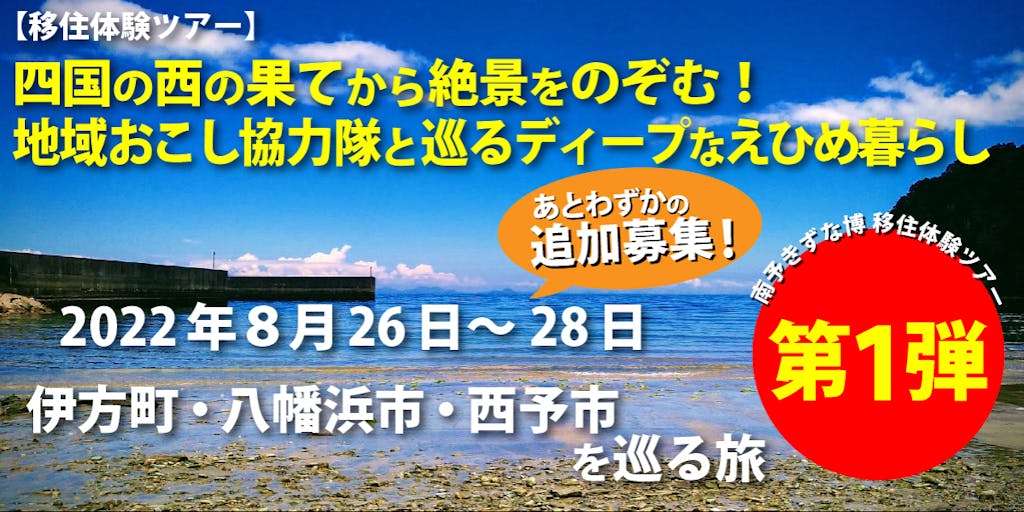 催行日】 令和4年8月26日(金)~28日(日) 2泊3日 集合:松山空港到着出口 8/26(金)11:15 解散:松山空港出発ロビー 8/28(日)16:00 【行き先】 愛媛県西宇和郡伊方町・八幡浜市・西予市 【事前オンライン交流会】 令和4年8月4日(木) 20:00~21:00 【事後オンライン交流会】 令和4年9~10月ころを予定 ※zoomを使用したオンライン交流会です。交流会もツアーの一部となります。 できる限りご参加いただけますようよろしくお願いします。 【ツアー行程】下記参照 【ツアー代金】 10,000円 (代金に含まれるもの)集合~解散までの交通費(ジャンボタクシー)、2日目昼食を除く6回の食事、ツアー中の体験料、宿泊費など ※往復のご自宅から松山空港間の交通費、2日目昼食代、夕食交流会でのアルコール類等は参加者負担。 【募集人員】 5名(申込多数の場合は抽選とさせていただきます)【最少催行人員】1名 【追加募集期間】 令和4年7月20日(水)~7月31日(日)(早期終了する場合があります) 【キャンセル料】7日前より100% 【添乗員】 なし 【案内人】 総合案内人1名が全日程帯同 他 各地域で地域おこし協力隊およびそのOB/OGが案内人をつとめます。 【宿泊先】(1日目)二名津わが家亭(愛媛県西宇和郡伊方町二名津205番地) https://www.futanazuwagayatei.com/ 注意事項:男女別の相部屋・シャンプー、タオルのみあり (2日目)ento house バー&ゲストハウス(愛媛県西予市野村町野村9-180) https://www.ento-house.com/ 注意事項:男女別の相部屋・タオル寝間着歯ブラシ類有料 (詳しくは上記サイトをご参照ください)