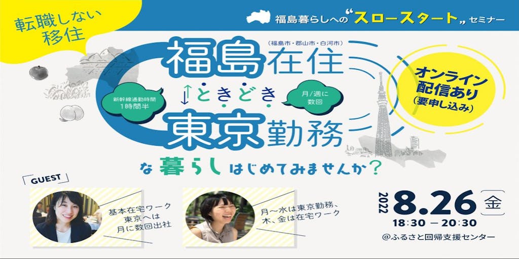2022/08/25移住っていうほどの覚悟はない・・・でも地方暮らしに興味はある。 そんな方はいませんか? 一番ネックになるのが転職ではないでしょうか。今の仕事は続けたい、給与水準が同じ仕事が地方で見つかるのか。 そんな中、転職しない福島暮らしを始めた二人をご紹介します。 コロナ禍で、在宅ワークができるようになった方、でも週に何度か、月に何度か出社が必要な方。そんな環境が整っている方は、東北新幹線が通る福島県中通り(白河市、郡山市、福島市)に住めば、転職しない地方暮らしができるかもしれません。 新幹線通勤1時間~1時間半の距離にある福島だからこそ、地方暮らしのスロースタートができます。合わなかったら帰ればいい。まずは福島に住んでみてから考えてみませんか。 今回のセミナーでは、ゲストの方から、「福島での仕事の仕方」、「東京への新幹線の中の過ごし方や交通費の事」、そして「福島に住んで暮らしや気持ちにどんな変化が生まれたか」など、実際に福島暮らしをしたから分かったことや感じたことをざっくばらんに聞いてみます。皆さんが気になることも直接お二人に聞いてみてくださいね。