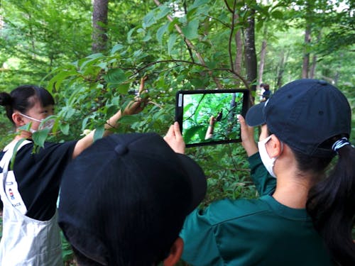 授業見学のあとは、林間で校長先生による特別授業「森のことばをつたえよう」。木や草花をよーく観察して、吹出しのセリフをつけることで、植物の個性を感じ、児童たちがお互いの発想を楽しみます。児童1人に1台 市から貸し出されているiPadも活用します!