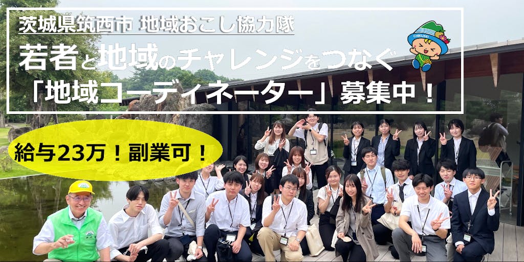 ※1:筑西市のまちづくりに興味がある学生で構成し、フィールドワークやグループワークを通じて若者の目線で魅力情報を発信し、まちの未来を考えたマイプロジェクト(学生自ら企画する賑わいを作り出すための提案等)の提言とその実現を目的としています。令和2年度に発足しました。 「地域コーディネーター」として、若者の地域活動を支援して、地域の人々や産学官連携により、若者の自由なアイデアの実現を図り、地域課題の解決や地域活性化等につなげながら、若者の活躍の場の提供と住みやすいまちづくりをすすめていただきます。