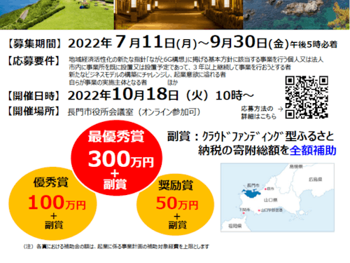 ■ながと若者起業家ビジネスコンテストについて ○募集期間:令和4年7月11日(月)~9月30日(金)午後5時必着 ○提 出 先:長門市役所 経済観光部 産業戦略課 企業誘致班 宛 ○審 査:プレゼンテーション審査 令和4年10月18日(火)(予備日10月17日) ※この審査は一般公開にて実施します ○表 彰: ビジネスコンテストの受賞者には、以下の副賞の金額を長門市若者起業家支援補助金として交付します。 最優秀賞 300万円、優秀賞 100万円、奨励賞 50万円 ※各賞における補助金の額は、起業に係る事業計画の補助対象経費を上限とします。 ※副賞に加え、受賞者の事業計画ごとに市が実施するクラウドファンディング型ふるさと納税により寄附を受けた総額を補助します。 ただし、補助対象経費を上限に、予算の範囲内とします。 ○受賞者以外の評価の高かった事業提案への支援 受賞者とは別に、審査委員会にて評価の高かった事業を、市長が「事業認定」した場合、認定事業ごとに、市が実施するクラウドファンディング型ふるさと納税により集めた寄付総額を、長門市若者起業家支援補助金として交付します。