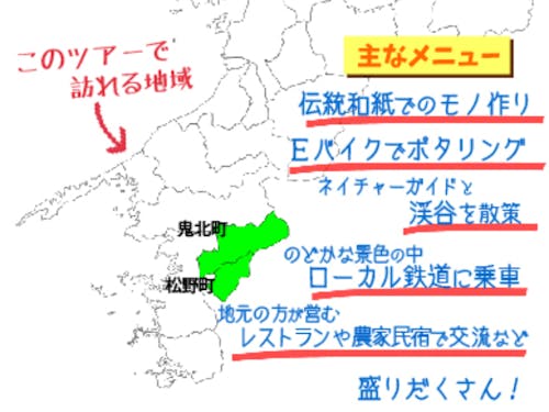 【催行日】 令和4年9月30日(金)~10月2日(日) 2泊3日 松山空港到着出口 9/30(金)11:15集合 松山空港出発ロビー 10/2(日)16:00解散 【行き先】 愛媛県北宇和郡鬼北町・松野町 【事前オンライン交流会】 令和4年9月17日(土) 15:00~16:00 【事後オンライン交流会】 令和4年9~10月ころを予定 ※zoomを使用したオンライン交流会です。交流会もツアーの一部となります。 できる限りご参加いただけますようよろしくお願いします。 【ツアー代金】 10,000円 (代金に含まれるもの) 集合~解散までの交通費(ジャンボタクシー)、ツアー中の体験料、食費宿泊費など ※往復のご自宅から松山空港間の交通費、夕食時などのアルコール類等は参加者負担。 【募集人員】 5名(申込多数の場合は抽選とさせていただきます) 【最少催行人員】1名 【募集期間】 令和4年8月1日(月)~8月26日(金) 【キャンセル料】7日前より100% 【添乗員】 なし 【案内人】 総合案内人1名が全日程帯同 他 各地域で地域おこし協力隊およびそのOB/OGが案内人をつとめます。 【宿泊先】(1日目) 農家民宿 山あじさい(愛媛県北宇和郡鬼北町大字奈良746) https://ehime-gtnavi.jp/archives/7309 注意事項:男女別の相部屋・アメニティなし (2日目) 農家民宿 あざみ野(愛媛県北宇和郡松野町目黒1430) https://www.guesthouse-azamino.com/ 注意事項:男女別の相部屋・アメニティなし・風呂はシャワールームのみ
