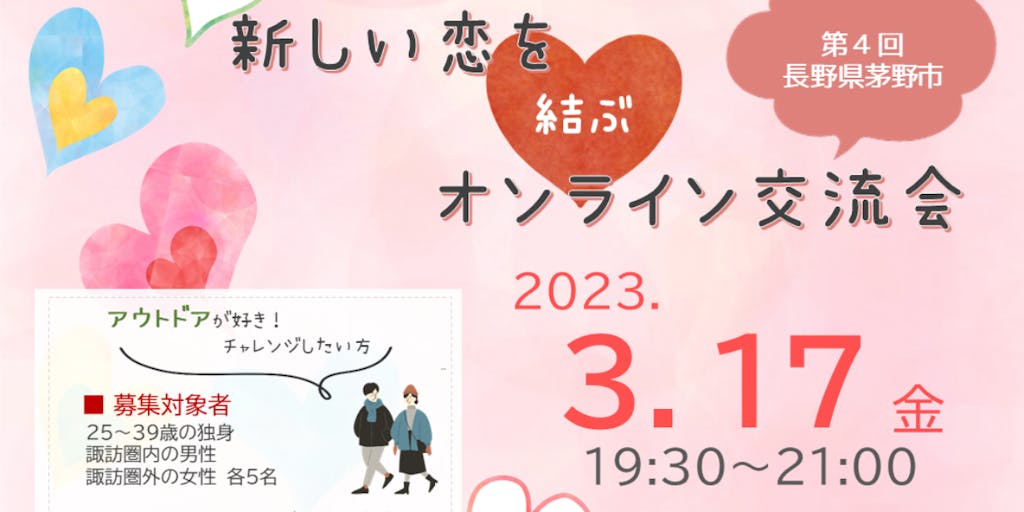 コロナ禍で出会いが少なくなり、茅野市でも婚姻数の減少が顕著になっています。 茅野市ではこれを地域課題として捉え、出会いの場を提供するお手伝いをしています。 「新しい恋を結ぶオンライン交流会」は過去に3回開催し、ご好評をいただいております。 今回は特にアウトドア(登山、キャンプ、写真など)が好きな方(興味がある)方を募集しています。まずは、茅野市の事を知っていただき、アウトドアの趣味を持つ方と出会えるきっかけになればと思っています。