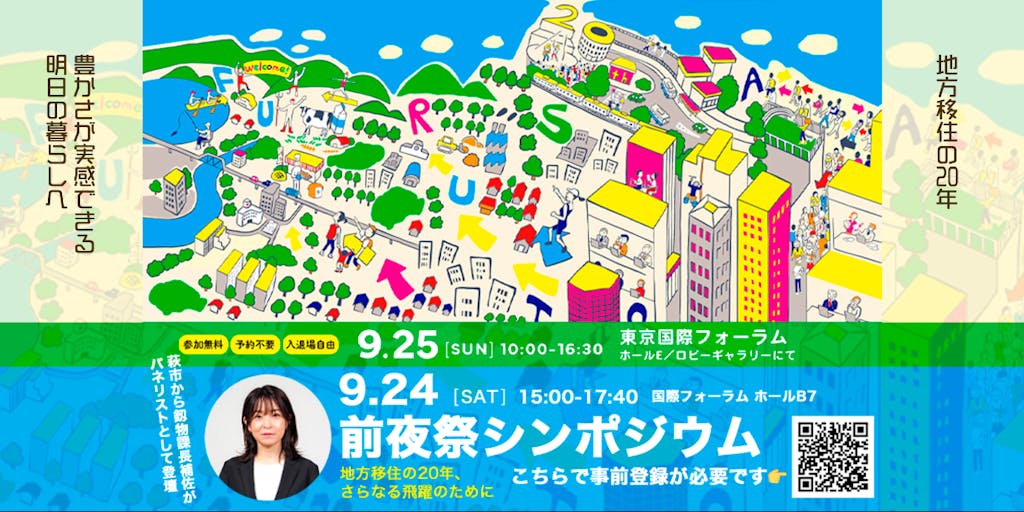 前夜祭シンポジウム 日時:2022年9月24日(土)15:00~17:40 会場:東京国際フォーラム ホールB7 内容: 〇記念講演 山本一太(群馬県知事) 15:10~16:10 「移住推進のための戦略的地域づくりとは」 〇パネルディスカッション 16:20~17:40 「地方移住の20年、さらなる飛躍のために」 <パネリスト> 山本 一太/群馬県知事 大村 慎一 /総務省新型コロナ対策地方連携総括官 兼 大臣官房地域力創造審議官 釼物 佳代子/萩市総合政策部 おいでませ、豊かな暮らし応援課 課長補佐 高橋 公 /認定NPO法人ふるさと回帰支援センター 理事長 <モデレーター> 山下 祐介/東京都立大学人文科学研究科 教授(社会学) ・各団体おすすめ資料&情報コーナー