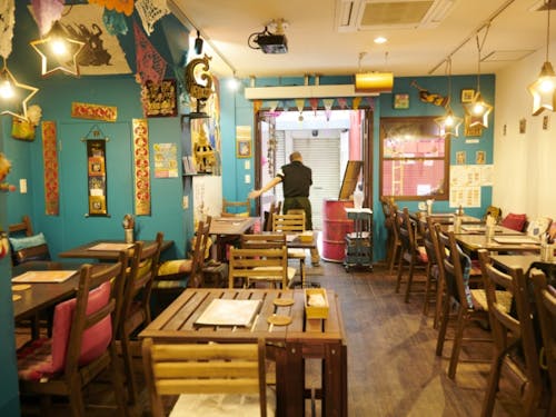 カラフルなランタンが店の外を彩り、異国情緒あふれる趣き。店内は目を引く大きな壁画をはじめ、ランタンやオブジェなどで装飾され、多国籍な雰囲気で満ちています。