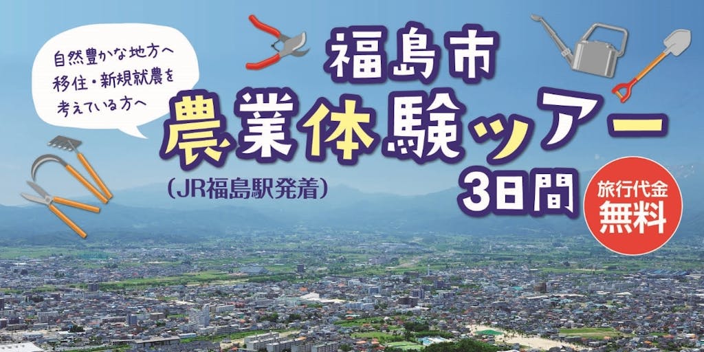 ・定員:5名 ・最小催行人数:1名 ・解散場所:JR福島駅西口 ・スケジュール: 1日目 13時 JR福島駅西口改札前集合 13時30分 福島市の農業、移住についてご説明 説明後、受け入れ農家をご案内いたします。 17時 ホテルへチェックイン(ホテル福島グリーンパレス)
