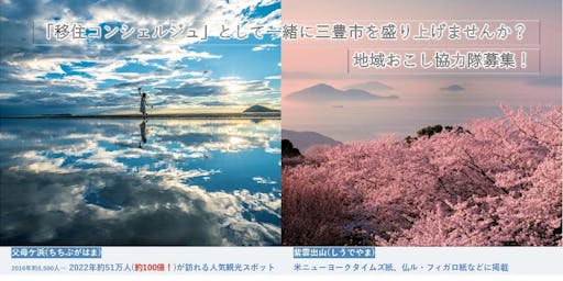 香川県三豊市(みとよし)は、近年「日本一の夕日」(じゃらん調べ)と呼ばれる父母ヶ浜が人気です。瀬戸内の穏やかな海と、まるでウユニ塩湖のような美しい景色が。 これまでは、観光地として知られていませんでしたが、今まさに三豊に観光産業が生まれようとしています。 新たな歴史の一ページを私たちと一緒に作っていきませんか?