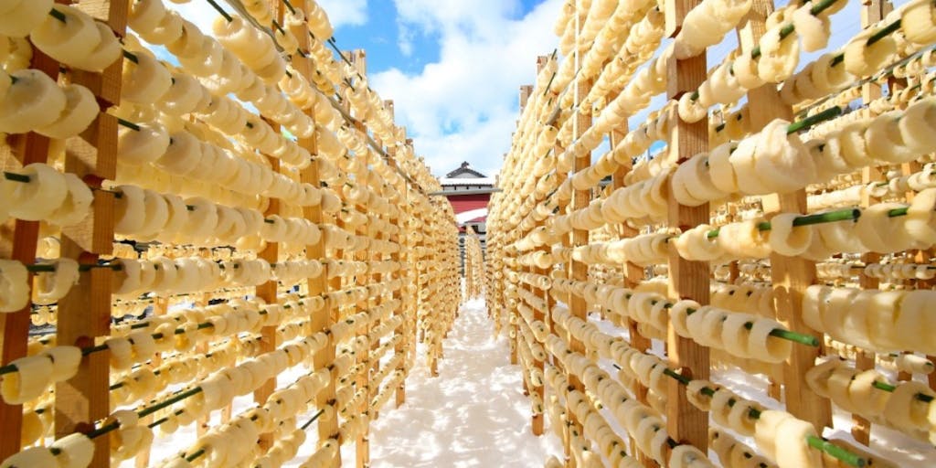 輪切りにした大根を茹で、それを串に通し1ヶ月前後乾燥させます。 串が刺さっていた穴がおへそに見えることから「へそ大根」と呼ばれ、 はっきりした寒暖差と乾燥した空気という作るのに絶好の条件と、 お母さんたちの愛情が加わったへそ大根は甘みが詰まって美味しいんです。