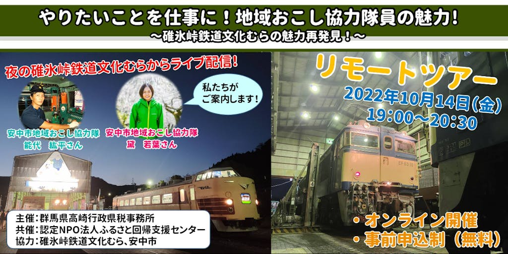 2022/10/13今回は鉄道ファン必見の企画をご用意しました! 群馬県安中市にある「碓氷峠鉄道文化むら」から、地域おこし協力隊の活動内容や市での暮らしをテーマにしたトークと、碓氷峠鉄道文化むらのオンラインツアーをお届けします!