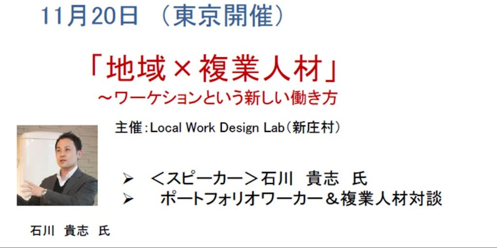 「地域×複業人材」 ~ワーケーションという新しい働き方 ポートフォリオワーカー&複業人材対談 石川 貴志 氏 日時:2019年11月20日(水)19:00~21:00(開場18:30)