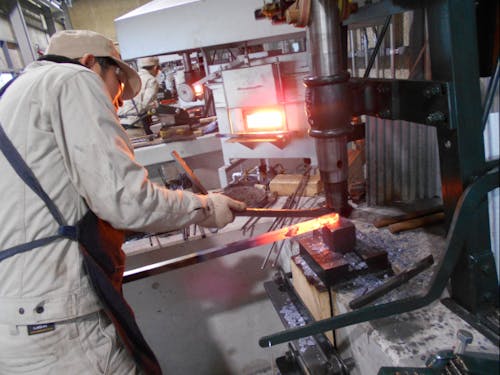 ーーーーー 「土佐打刃物」って? 「土佐打刃物」の歴史は江戸時代から続く400余年。古式割り込み鍛造製法技術と伝統は、21世紀になった今でも変わることなく受け継がれています。その特徴の一つに、金属材料を適当な高温に加熱し、プレスまたはハンマーを用いてその上下金敷間で力を加えて鍛造加工を行う「自由鍛造」という技法があります。決まった型がなく、打って伸ばし広げるといった鍛造の基本作業を製品の使用目的や用途に応じて組合せ、鍛錬・形成していくので、使い手の細やかな要望にも応えることができるんです。
