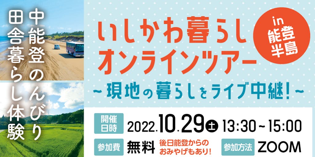 2022/10/18大好評をいただいている「いしかわ移住オンラインツアー」 今回は能登半島の真ん中へんにある、羽咋市、七尾市、中能登町の3市町が舞台! 地域の魅力を現地から生中継します! お申し込みは興味あるボタンとともに下記から! ▽ https://form.run/@colorfulcompany-1663054474