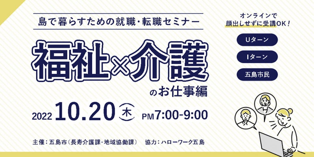 2022/10/18五島市の福祉・介護業界は人手不足となっています。 それを解消するため、五島列島・五島市への移住を検討されている方で福祉・介護のお仕事に興味をお持ちの方を対象に、島内の福祉・介護団体とのマッチングを目的とした特別なオンラインセミナーを開催します。