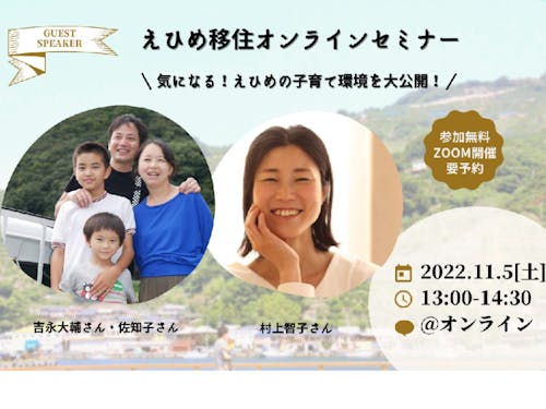 11月5日(土)は、えひめでの子育てをテーマにした『移住オンラインセミナー』と、移住相談をしてみたいけど不安、踏み出せないという方に向けた『移住検討の“ファーストステップ”セミナー』の2本立てでお送りします♪