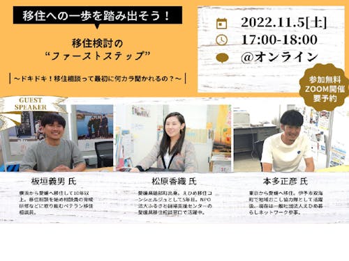 ■移住検討の“ファーストステップ” ~ドキドキ!移住相談って最初に何カラ聞かれるの?~ 日時:2022年11月5日(土)17:00~18:00 参加方法:オンライン(Zoom利用) 参加費:無料 申込期限:2022年11月4日(金)10:00まで 詳細:下記リンク先よりご確認ください。 https://e-iju.net/event/ehimegurashifair4-2/